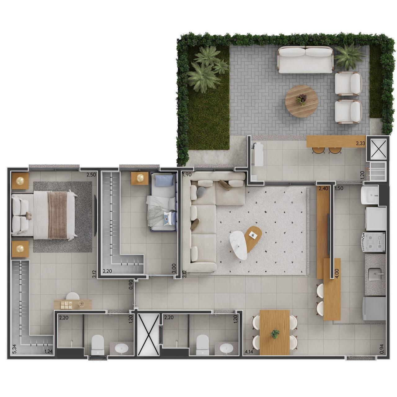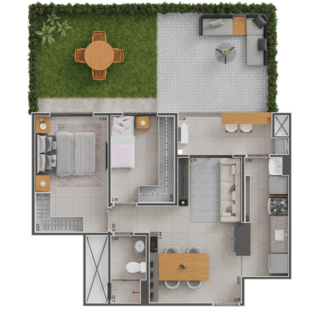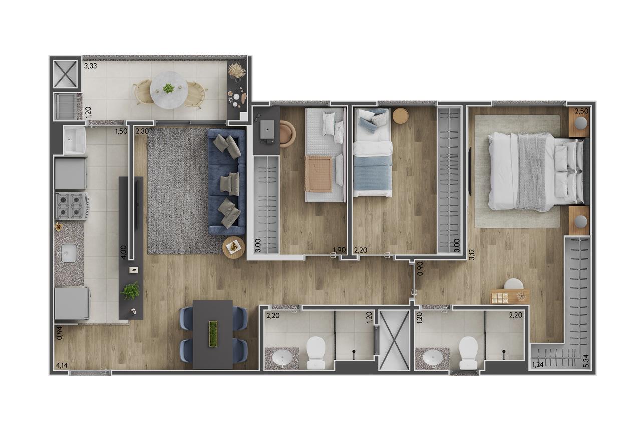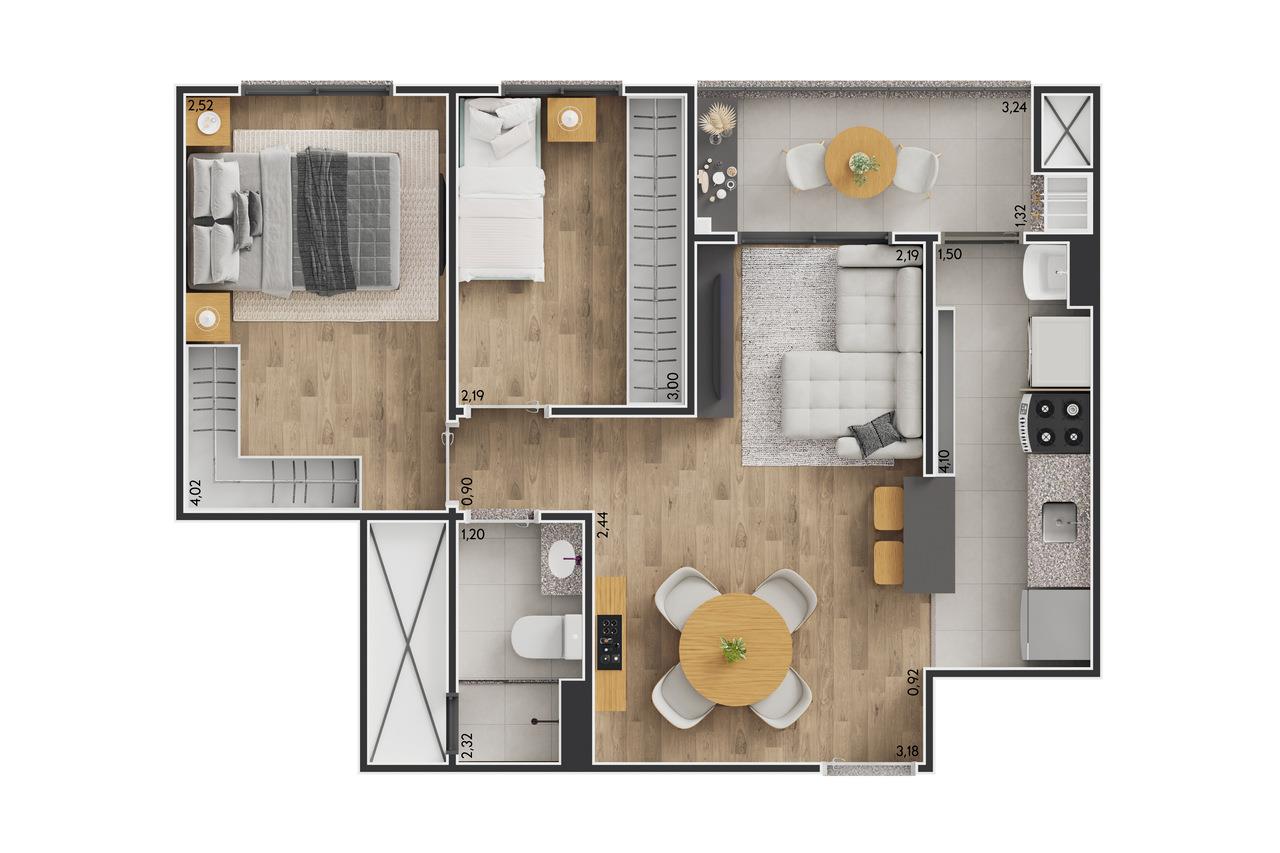 Com opções de apartamentos de 51m² e 64m², o Arpeggio oferece plantas inteligentes com 2 ou 3 dormitórios, sacada com churrasqueira e ambientes integrados, perfeitos para quem busca praticidade sem abrir mão do estilo.